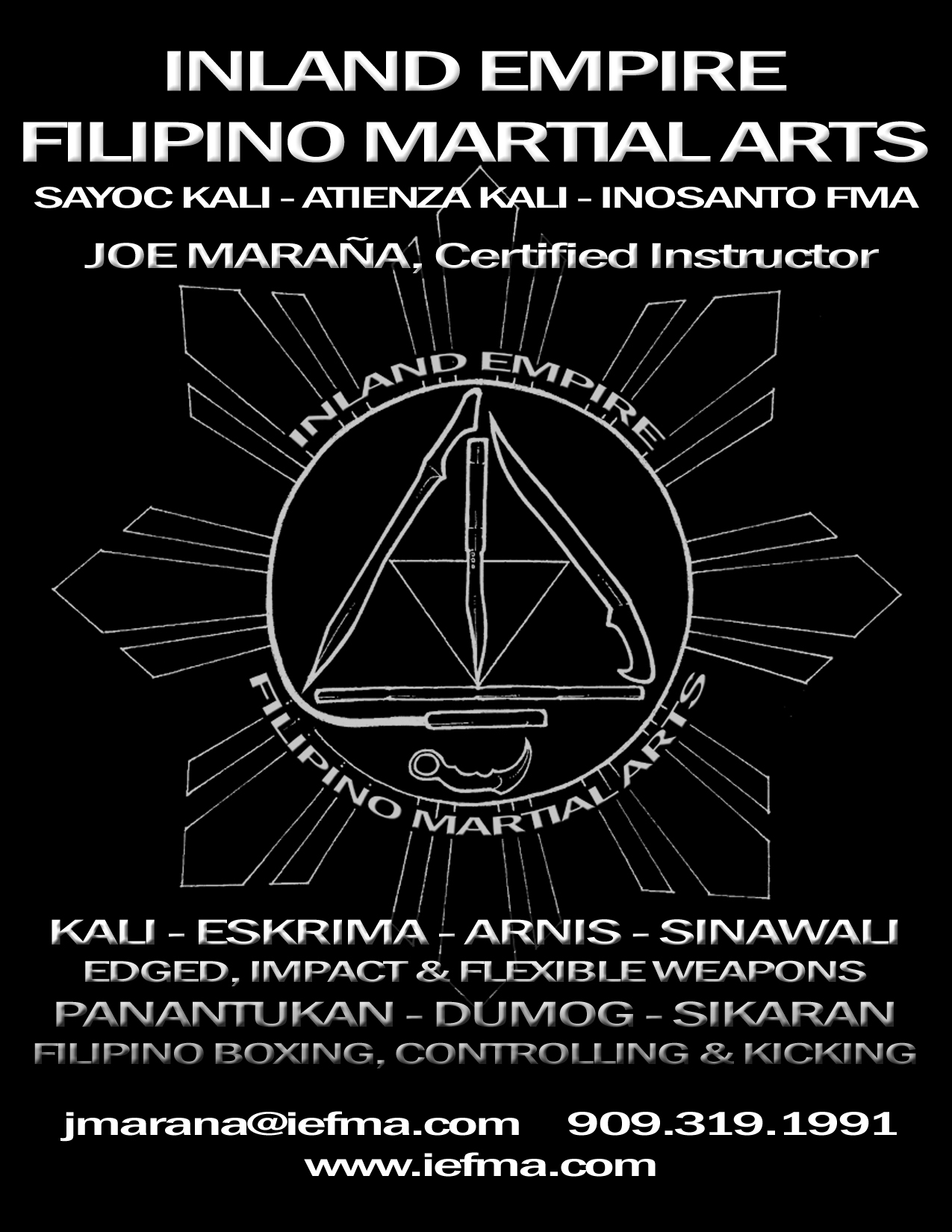 Inland Empire Filipino Martial Arts (IEFMA) provides training in Sayoc Kali, Atienza Kali and Lacoste-Inosanto Filipino Martial Arts in Southern California’s Inland Empire. IEFMA provides instruction in edged, impact and flexible weaponry as well as their unarmed compliments. Commonly known as Kali, Eskrima or Arnis the Filipino Martial Arts encompass combative strategies and tactics born from centuries of combat, by Filipinos and Filipino Americans. IEFMA is a Sayoc LA training group, recognized by the Sayoc Global organization and strives to continue developing and producing the capable individuals that Sayoc LA has fostered throughout Los Angeles and Southern California.